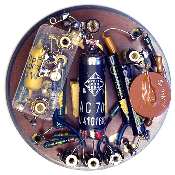 Pertinaxskivan, som komponenterna är monterade på, sitt på en bakelitskiva som ger stadga och är fäste för transformatorn.