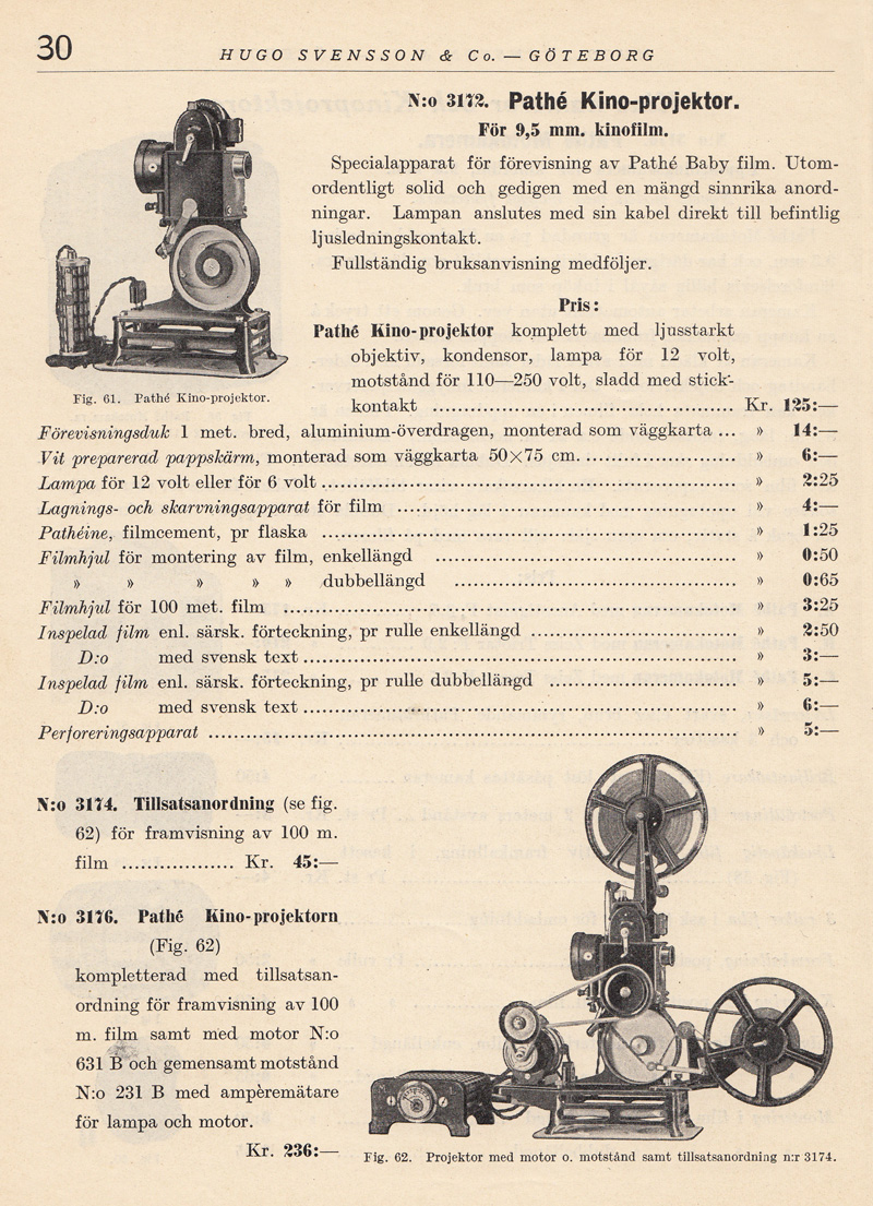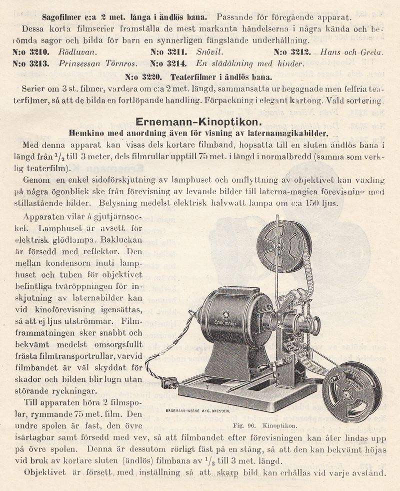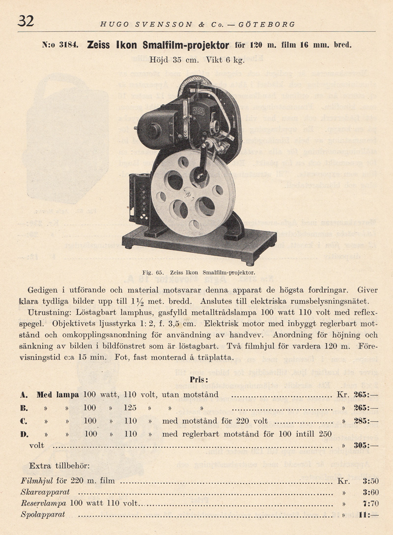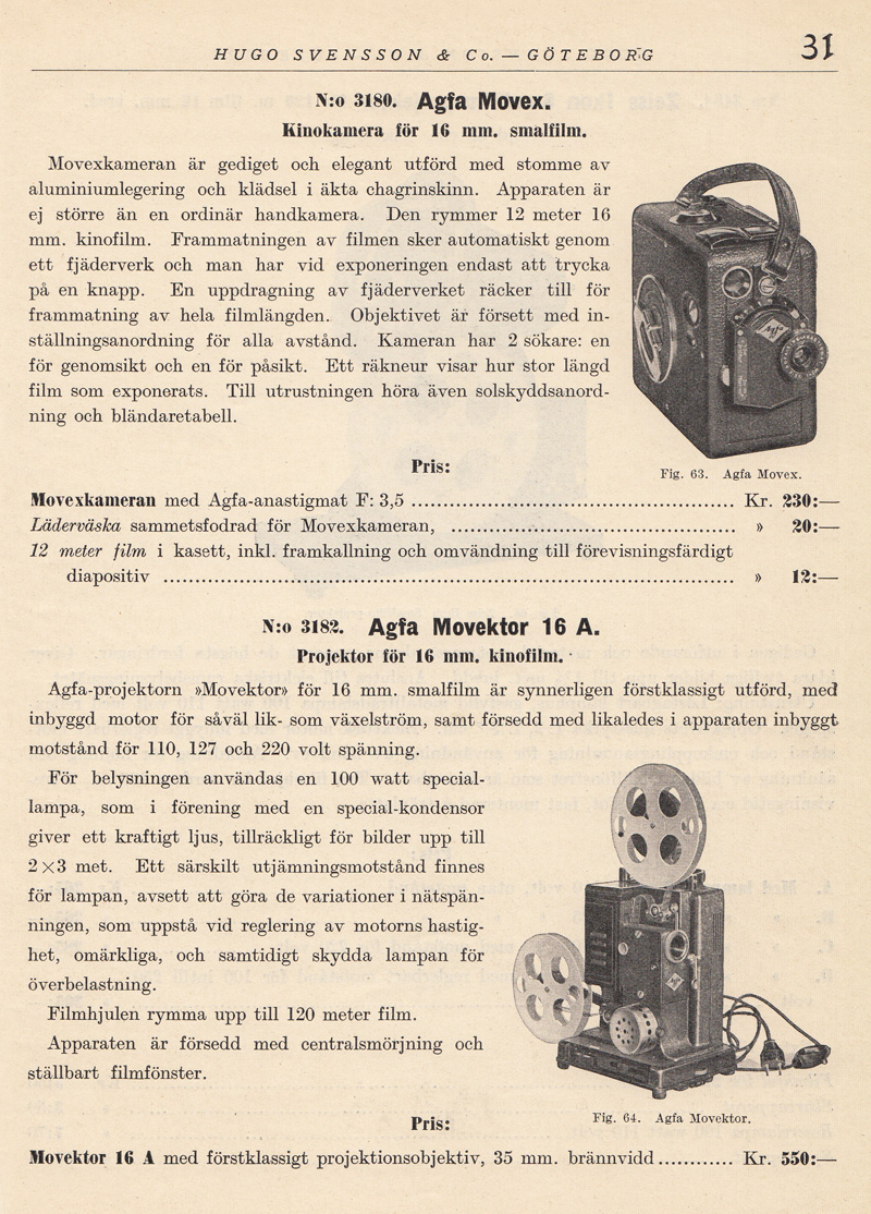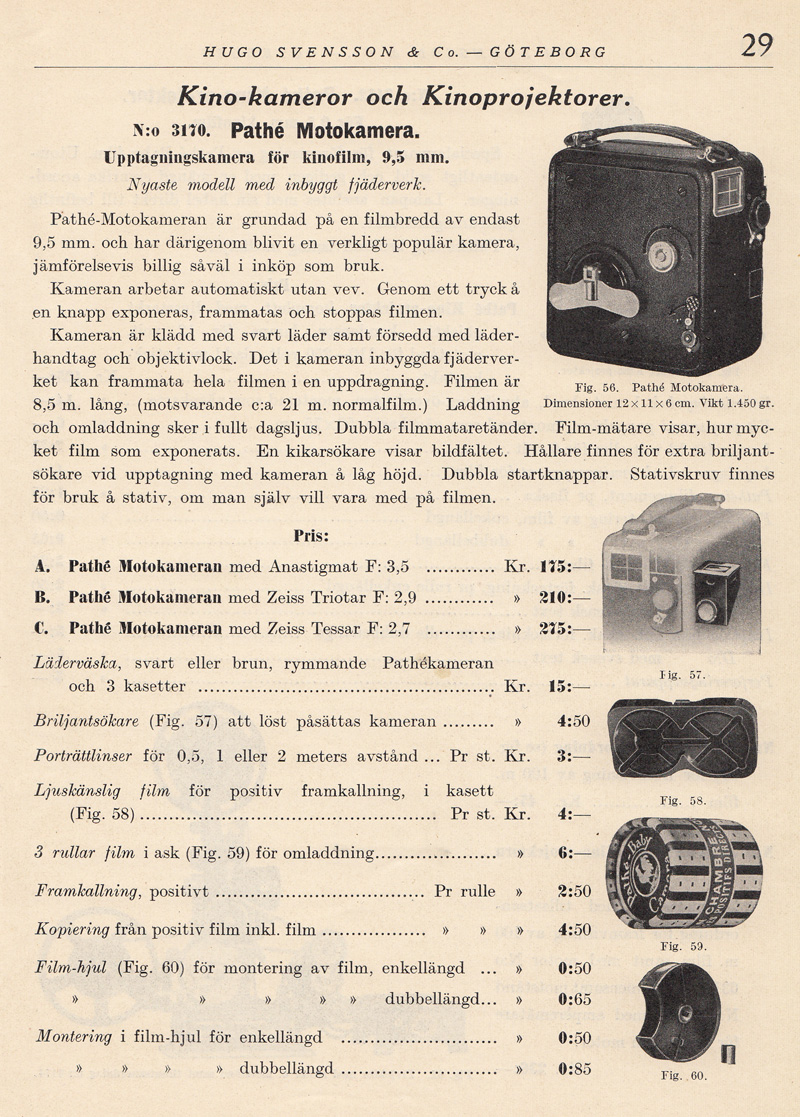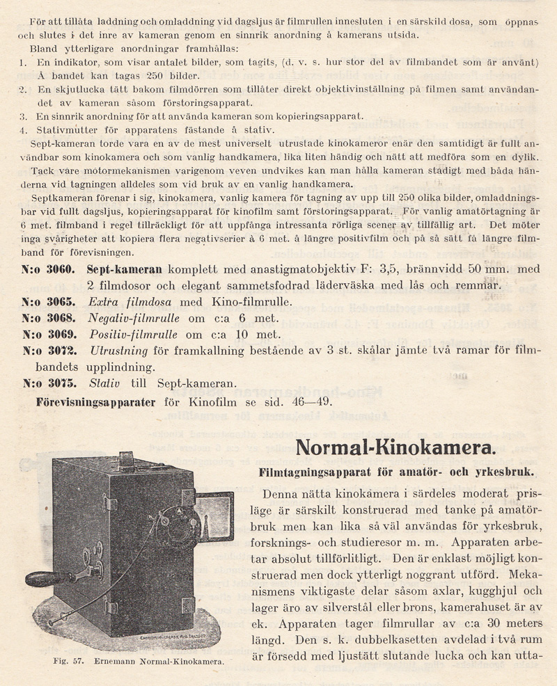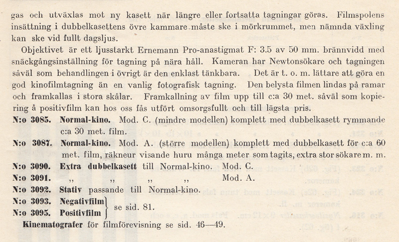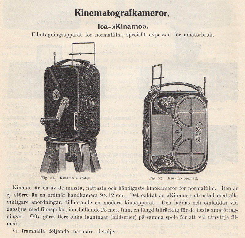 kassetter som lätt kunde bytas i dagsljus. Det kom även en modell av Kinamo-kameran som hade en genomsiktssökare. I den kunde man se objektivets skärpeinställning och förmodligen speglade man in skärpereglagets läge. Därav ordet ”spegelreflexssökare” i katalogtexten ovan. Efter sammanslagningen år 1926 av ICA, Goerz, Contessa Nettel, Carl Zeiss, och Ernemann, fortsatte Zeiss Ikon att bygga Kinamo-kameror. Med tiden tillverkades Kinamo även i en version för 16 mm film. Klicka här om du vill titta på en sida ur Forsners utdragslista för Zeiss Ikon-kameror från 1928 men Kinamo-modeller. Pathé lanserade 9,5 mm-formatet 1922. Bell & Howell började sälja sin lilla Eyemo-kamera 1923. Den var avsedd för 35 mm film. Samma år lanserades 16 mm-formatet av Eastman Kodak Company. |