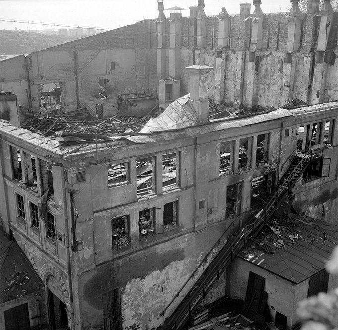 senare kommer att kallas för Studio 4, stod färdig 1953-54. Lagerutrymmen att ta i bruk hade SF sedan tidigare i kvarteret Svärdfisken, där biografen Skandia låg, och de första åren efter branden använde man lokaler på Drottninggatan 82 som lager, porten till vänster om biografens entré. ![]() Kvarteret Svärdfisken. Den här delen av Tunnelgatan heter idag Olof Palmes gata. Men ganska snart samlade SF istället allt som skulle förvaras och arkiveras i stora källarutrymmen som gick att nå både från Tunnelgatan 13a och Apelbergsgatan 50. Det gick även att ta sig dit via trappor och gångar under Skandia-biografens scengolv. De nya lagerlokalerna kallades Centrallagret. Centrallagret drabbades av en förödande översvämning 1974. |