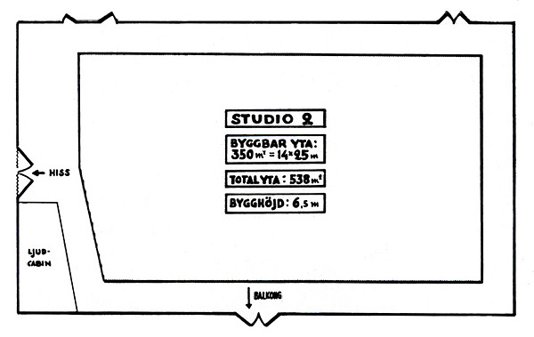 Den inglasade filmateljén låg högst upp i byggnaden. På förslag av Mauritz Stiller var ateljén utrustad med en vridscen så att uppställningarna skulle kunna följa solljuset, men den kom i stort sett aldrig till användning. Bottenvåningen var under de första åren plats för möbelmagasin och rekvisitaförråd. Där nere, och på mellanvåningen, fanns också omklädningsrum och sminkrum för statister. En stor hiss gick mellan möbelhallen i markplanet och ateljén. Hissen var placerad på utsidan av husets västra kortända. Under södra långsidans balkong fanns ett växthus. (Dock inte på den här bilden, som är tagen under byggperioden.) Lilla och stora ateljén ljudisolerades 1932-33. Omkring 1960 börjar man kalla Lilla ateljén för Studio 2. |