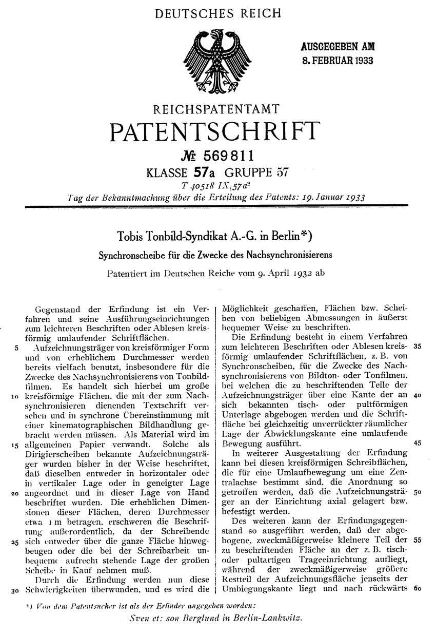 Förenkling. Dubbeluppsättningar för olika språkversioner onödiga. SVENSK UPPFINNING. Översättningsateljéer planerad i flera huvudstäder. Svenska Dagbladet, den 13 januari 1932 (Från vår Berlinredaktion.) BERLIN 11 jan. Den svenske ingenjören Sven A:son Berglund, som sedan år 1928 är anställd vid Tonbild-Syndikat A.-G. i Berlin, vanligen förkortat till Tobis, har uppfunnit och fullkomnat ett förfarande, som av alla tecken att döma kommer att tillförsäkra ljudfilmen samma internationella avsättningsmöjligheter som stumfilmen. Genom en storstilad mätningsapparatur för det fotograferade ljudet är det möjligt att åstadkomma en fullständigt illusorisk översättning av en film från ett språk till ett annat och att anpassa filmen efter ljudet och vice versa. Ursprungligen var det grammofonbolaget Polyphon, som började experimentera med grammofonskivor för att fullkomna synkroniseringsprincipen. Sedermera bildade Polyphon och Tobis ett bolag, Topholy, som fortsatte experimenten, och numera har det kommit så långt, att förfarandet skall tillämpas i praktiken. För de mindre länderna, som hittills huvudsakligen varit hänvisade till de tre stora internationella språken, är förfarandet givetvis av största betydelse. Några dubbeluppsättningar med dekorationer för de olika språkversionerna äro ej längre nödvändiga, utan man kan inskränka sig till huvudaktörerna framför mikrofonen. Översättningen kunna intalas och insjungas var som helst, och i huvudstäderna på kontinenten planeras redan särskilda översättningsateljéer. ![]() Ingenjör Sven A:son Berglund är en av ljudfilmens banbrytare — på ett mycket tidigt stadium hade han fullkomligt klart för sig ljudfilmens principer och försökte även genom träget arbete att utexperimentera densamma och lyckades även därmed. Han är nu en av de ledande männen i den stora tyska Tobiskoncernen och hans namn borgar för att hans nya uppfinning är betydelsefull. Helt ny är idén icke, ty Paramount t.ex. har just i dagarna avslutat en ”översättning” till svenska i sina ateljéer i Paris av en amerikansk ljudfilm, svenska skådespelare ha alltså talat, medan amerikanska agerat på duken. Med spänning måste man onekligen motse resultatet av detta experiment, som kommer att framföras inom kort för allmänheten. Det är ju mycket vanligt att uppfinningar göras samtidigt och oberoende av varandra på olika punkter på klotet. Så tycks även fallet vara här — det är inte första gången i filmens och ljudfilmens historia att detta har inträffat. Av telegrammet att döma förefaller det emellertid, som om ingenjör Berglunds uppfinning innebär en betydelsefull förenkling av det hittills tillämpade förfarandet. |