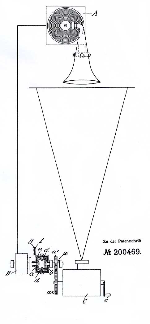 Nedan en bild från Messters patent nr 200469, beviljat den 29 april 1906.