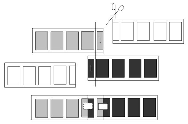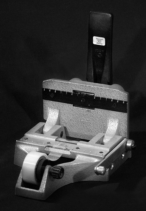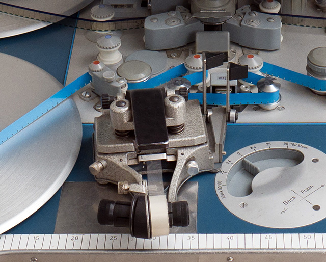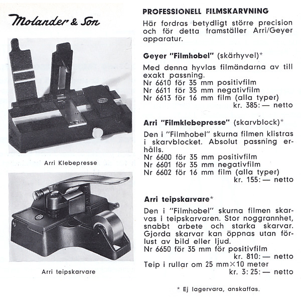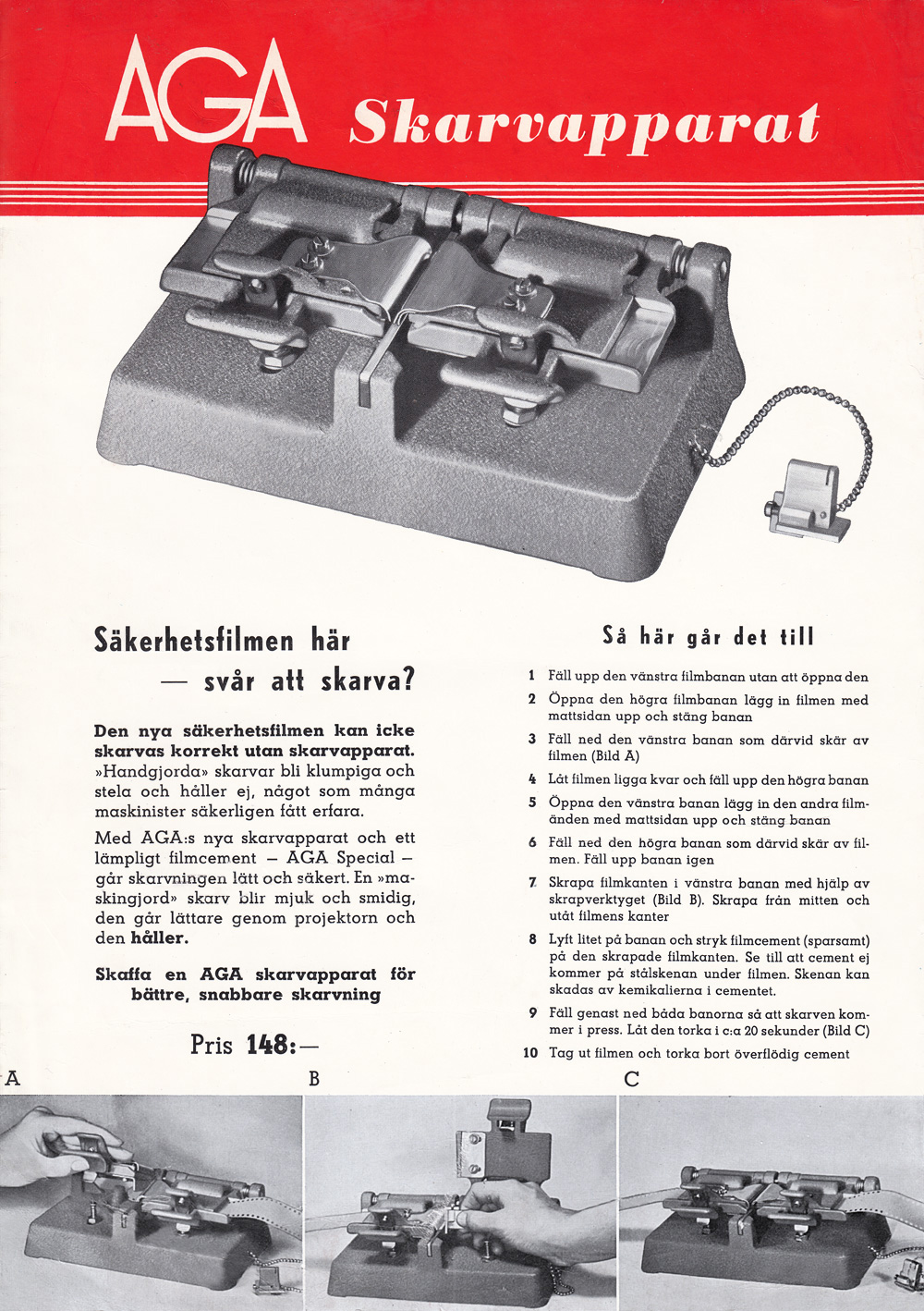 nämligen att skiktet följde med när man bröt upp skarven. Innan filmen skulle köras i projektor måste man tejpa även klippens skiktsida. Det momentet kallades att dubbelskarva, och var nödvändigt eftersom klippen annars kunde gå upp och filmen spjälkas av projektorns omilda behandling. ![]() |