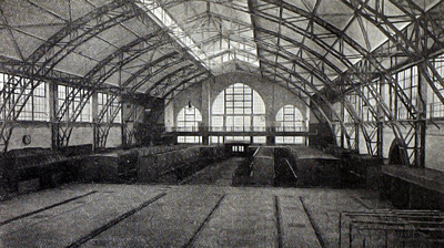 medelst ramper och portaler vid hallbyggnadens båda gavlar. Från hallen