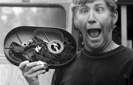 projektor, klippbord och perfomaskin hade byggts om för tvåperf-matning.