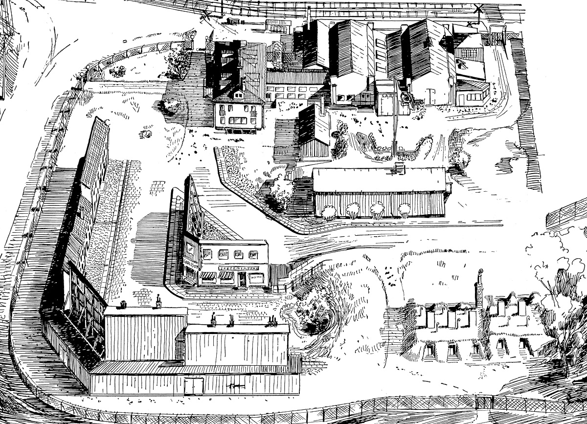 I skissens mitt, vinkelrätt mot verkstaden, syns en stor