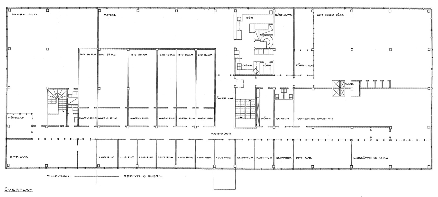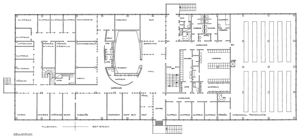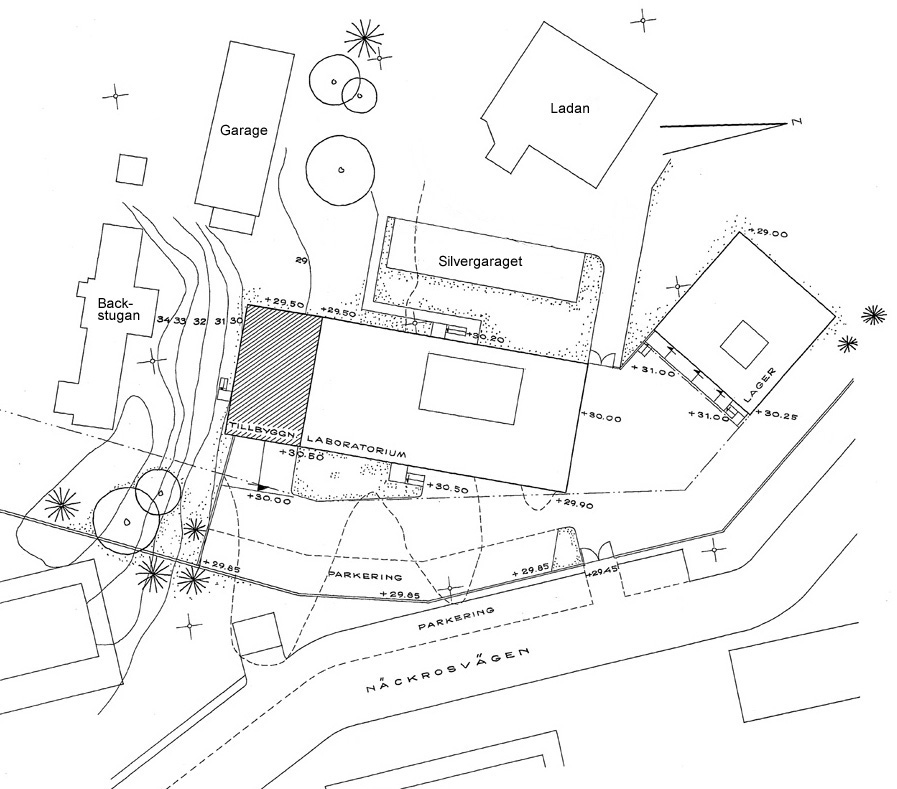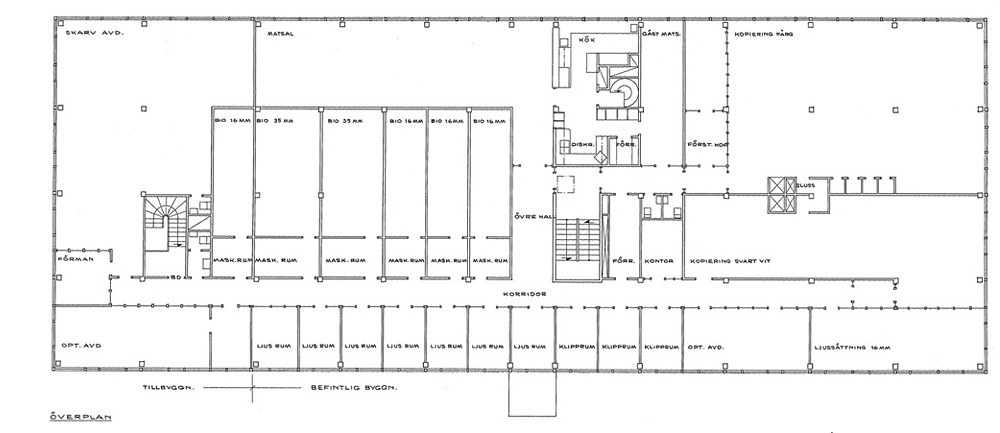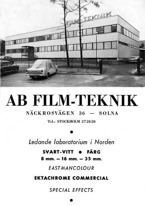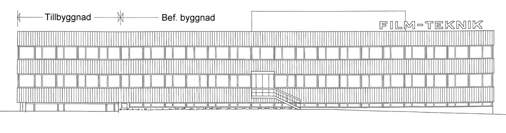 och blev Råsundavägen. Film-Tekniks nya adress blev då Råsundavägen 133 (33+100). År 1948 flyttade labbet till de översta våningarna i Elverkets hus på Råsundavägen 101. Där hade man just installerat sina första maskiner för framkallning och kopiering av 35 mm svartvit film. Färgfilm i 35 mm-formatet började man arbeta med 1954. Svensk Filmindustri överlät från den 1 januari 1957 laboratorieverksamheten i Filmstaden till AB Film-Teknik. Tanken var att Film-Teknik skulle arbeta med svartvit film i Filmstadens labb och ägna sig åt färgfilm på Råsundavägen 101. (SF fortsatte att driva Filmstadens text- och stillbildslaboratorium i egen regi. De verksamheterna hade sina lokaler i Filmstadens laboratoriebyggnad.) Fastighetsaktiebolaget Hufvudstaden köpte en tredjedel av aktierna i AB Film-Teknik 1957. SF anhöll 1959 genom Birger Juberg om bygglov för ett filmlaboratorium på Näckrosvägen 36 i Solna. Huset skulle bli 20x39 meter. Källare och två våningar. Ansökan beviljades. SF byggde samtidigt ett filmlager på 20x20 meter alldeles intill laboratoriet. Också det huset fick källare och två våningar. Film-Teknik flyttade från sina gamla lokaler på Råsundavägen (och från Filmstadens labb) till det nya huset på Näckrosvägen den 1 juni 1960. Slutbesiktning av nybygget skedde den 8 december 1960. Här kan du läsa om när Film-Teknik började framkalla färgfilm. |
