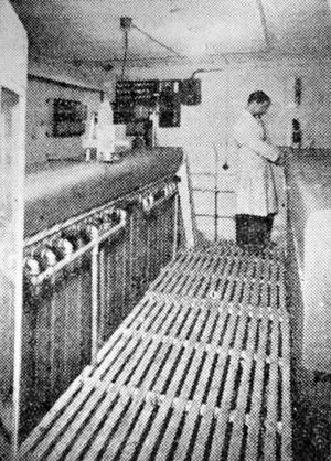 efter utan tvärt om.Hela proceduren sker vid vanligt vitt ljus och helautomatiskt från första badet till torkningen. De två rostfria apparaterna man hittills fått färdiga — de kostar modiga 40.000 kr. vardera — framkallar ej mindre än 600 m film per timme. I de redan för trånga lokalerna, där femton personer sysselsätts, sker också nedkopiering av stum- och ljudfilm från 35 till 16 mm, samt uppkopiering. Texter inkopieras även och inom kort kan amatörer få tala in text till sina egna 16 mm:s filmer. Framkallning i dagsljus.
