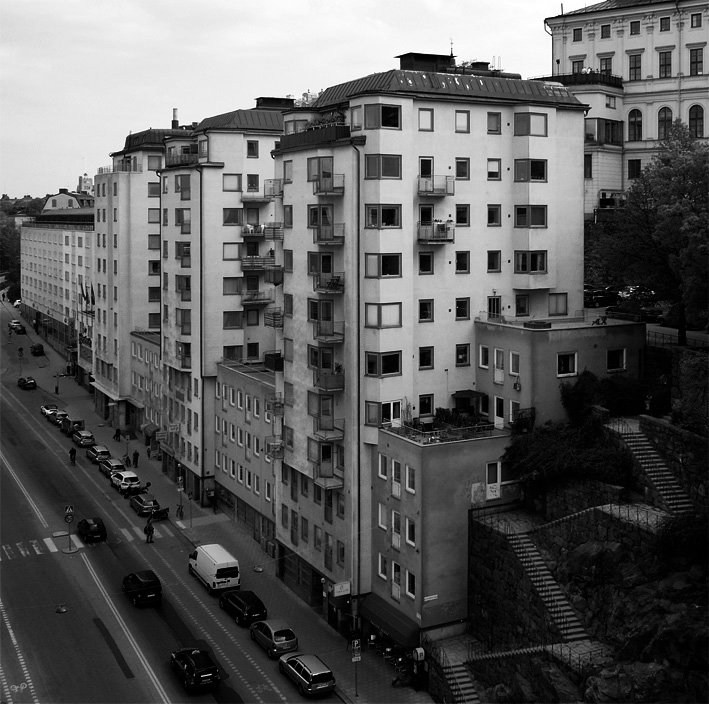 Fyra våningar butiker och kontor längst ner, resten bostäder. Adressen är Katarinavägen 18-22 i Stockholm.