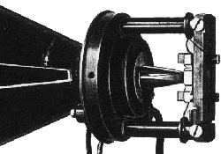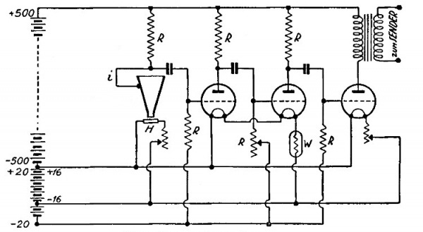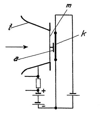 med en tratt som fångar upp ljudet. Anoden får en positiv laddning från