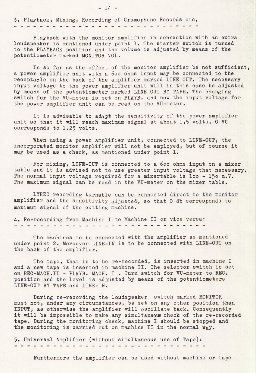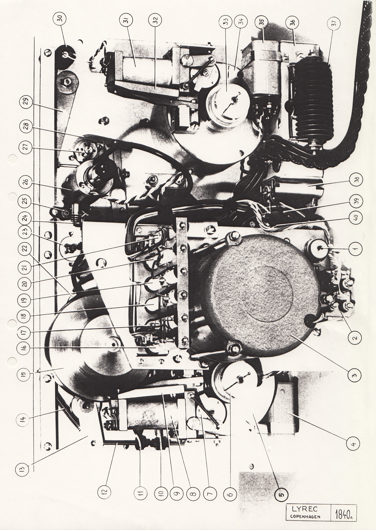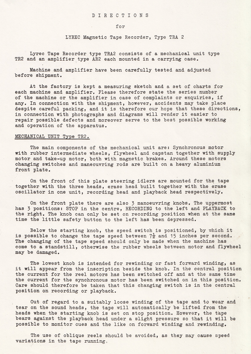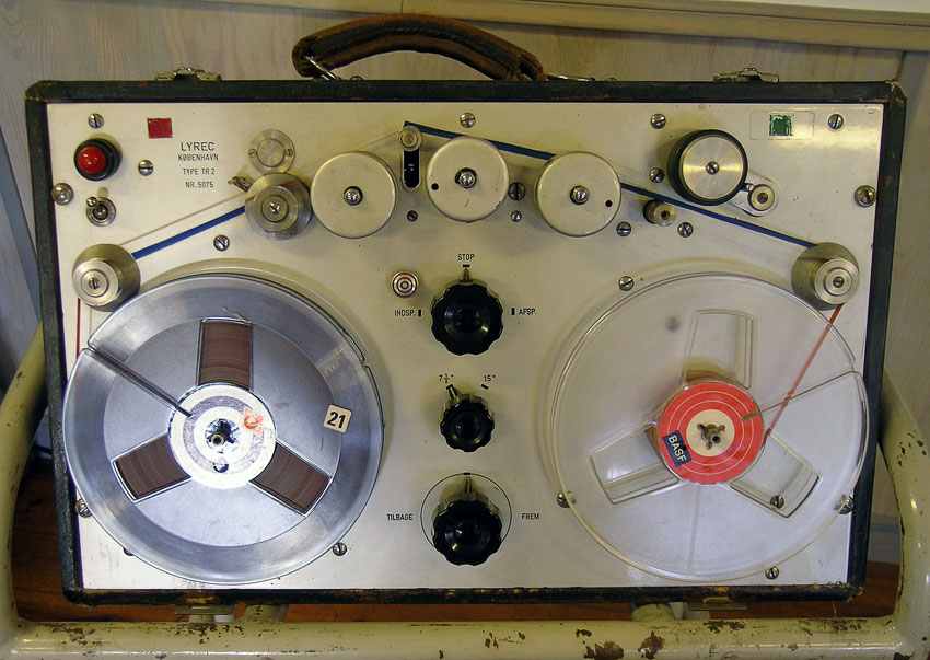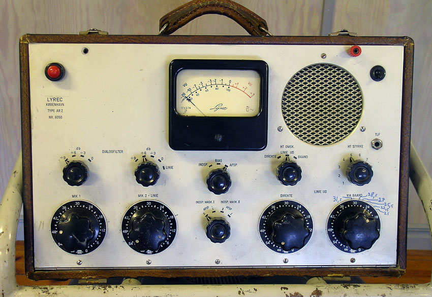 Köpenhamn. År 1951 lanserade man en 1/4"-bandspelare med beteckningen TR2/AR2 som var tillverkad enligt specifikationer från Danmarks Radio. (TR2 är själva bandspelaren, AR2 är förstärkardelen.) Lyrec TR2 är en fullspårs- eller halvspårsbandspelare med tre tonhuvuden: radering, inspelning & avspelning. Bandhastigheter: 19 cm/s (7 1/2") och 38 cm/s (15"). Kapstanmotor och två spolmotorer sköter bandtransporten och max. spolstorlek är 7". Bandspelaren har två mikrofoningångar, en linjeingång och en linjeutgång. Alltihop drar 250 watt. I början av 50-talet började AEG Magnetophon- och Lyrec-bandspelare gradvis ersätta de optiska tonkamerorna vid exteriörinspelningar på SF och Sandrews. I november 1958 kostade TR2 5.200 DKK (danska kronor), och AR2 3.250 DKK. Lyrec A/S upphörde med sin verksamhet år 2007. |