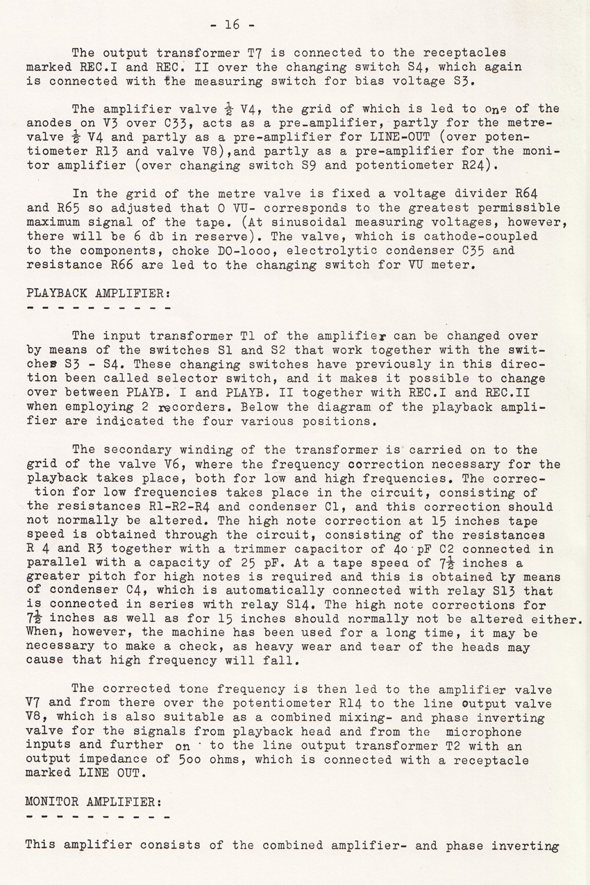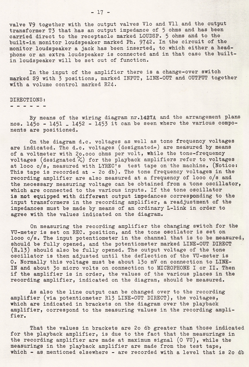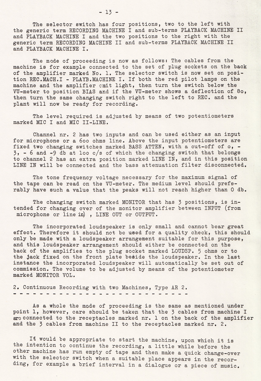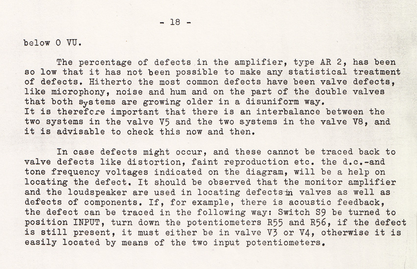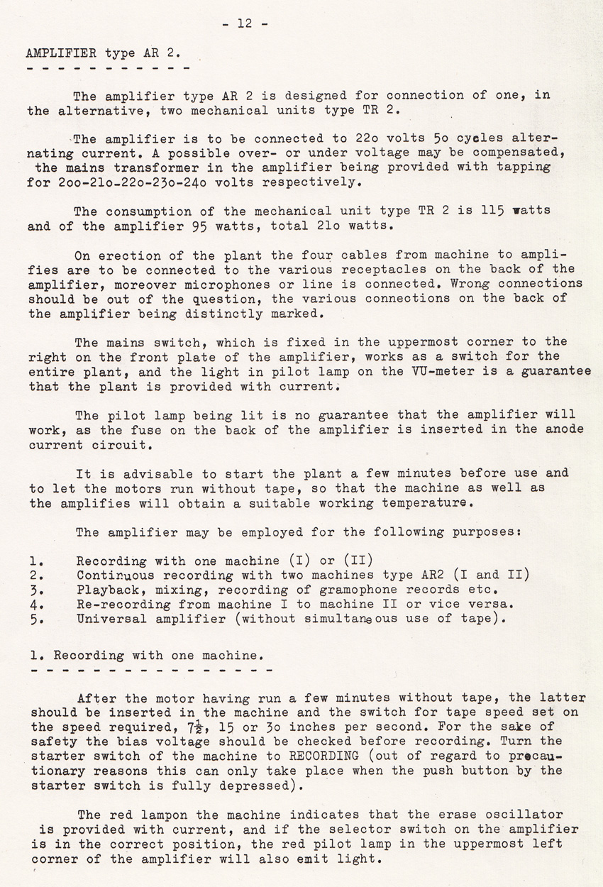 Köpenhamn. År 1951 lanserade man en 1/4"-bandspelare med beteckningen TR2/AR2 som var tillverkad enligt specifikationer från Danmarks Radio. (TR2 är själva bandspelaren, AR2 är förstärkardelen.) Lyrec TR2 är en fullspårs- eller halvspårsbandspelare med tre tonhuvuden: radering, inspelning & avspelning. Bandhastigheter: 19 cm/s (7 1/2") och 38 cm/s (15"). Kapstanmotor och två spolmotorer sköter bandtransporten och max. spolstorlek är 7". Bandspelaren har två mikrofoningångar, en linjeingång och en linjeutgång. Alltihop drar 250 watt. I början av 50-talet började AEG Magnetophon- och Lyrec-bandspelare gradvis ersätta de optiska tonkamerorna vid exteriörinspelningar på SF och Sandrews. I november 1958 kostade TR2 5.200 DKK (danska kronor), och AR2 3.250 DKK. Lyrec A/S upphörde med sin verksamhet år 2007. |