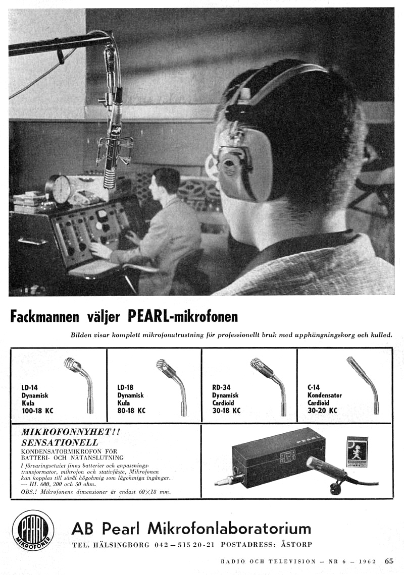 på alla amerikanska radiostationer. Källa: Sven Fahlén och Lars Klettner. Mikrofonen är en Pearl C-2. Mikrofonupphängningen är också från Pearl, konstruerad av Bernt Malmqvist. |