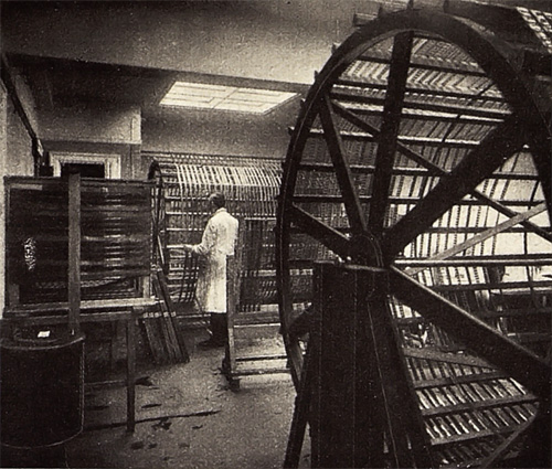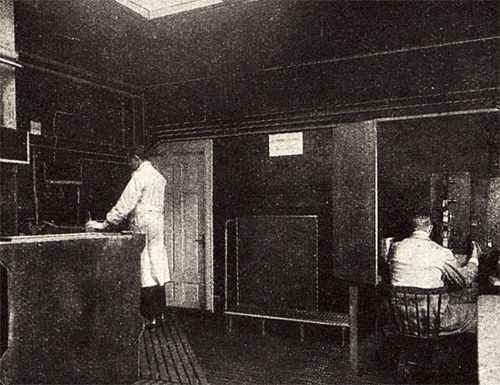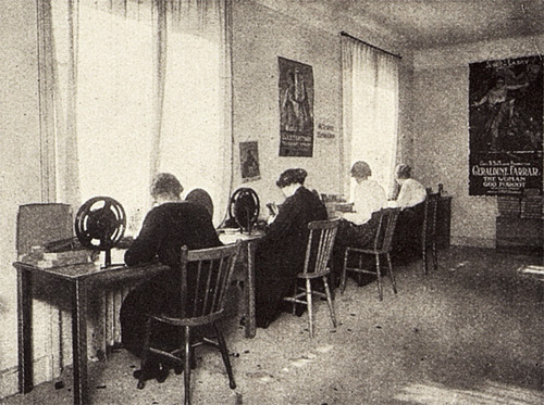 I Palladium-huset hade Filmcentralen kontor, lagerlokaler, filmsyning, förevisningssal och en manusavdelning. Dessutom ett filmlaboratorium på vindsvåningen där man tillverkade texter samt framkallade och kopierade bland annat firmans journalfilmer. Labbet var ”modernt inrett för allt filmfotoarbete”. ![]() Laboratoriet. Framkallning till vänster. Mannen till höger kör en kopieringsmaskin. ![]() Torktrummor. ![]() Filmtvätt. ![]() Filmsyning. Till höger en affisch för Cecil B. DeMilles film The Woman God Forgot (1917). ![]() Förevisningssal, körrum. (Interiörbilderna ovan kommer från ett häfte om Skandinavisk Filmcentral, utgivet 1919.) Filmcentralen drev biografer i Falun, Helsingborg, Göteborg, Karlskrona, Landskrona, Malmö, Norrköping, Stockholm, Uddevalla, Västervik och Västerås. Allt som allt ett 20-tal och många med namnet Palladium. Och som andra filmdistributörer vid den här tiden sålde Filmcentralen även utrustning, bland annat projektorer, båglampor, omformare, motorer, filmkameror och klaffstolar. Från 1919 ägnade sig firman dessutom åt filmproduktion. Lars Björck hade köpt A/S Kinografen och Dania Biofilms ateljéer i Hellerup utanför Köpenhamn och bildat A/S Palladium för att sköta filmproduktionen där. Filmcentralen hade även köpt en tomt vid Skurubron i Nacka utanför Stockholm där man planerade att uppföra ateljéer. Men det bygget blev aldrig av. Erik A. Petschler och Gustaf Molander debuterade som regissörer för Filmcentralen i Sverige. Petschler gjorde filmen Baron Olson sommaren 1919 och Molander Bodakungen sommaren 1920. För att få loss pengar sålde Lars Björck i slutet av 1920 sina ateljéer i Hellerup till A/S Palladiums ekonomichef i Danmark, Svend Nielsen. Filmcentralen hade nämligen dragit på sig stora skulder. Enbart inspelningsverksamheten hade gått med 2 miljoner kronor i förlust. De sista dagarna i december 1921 gick Filmcentralen i konkurs. Enligt Filmbladet den 4 februari 1922 var bristen i kassan, när tillgångarna dragits från skulderna vid konkurstillfället, 5.244.545 kronor och 59 öre. Amerikanska intressen arbetade intensivt för en rekonstruktion. De hade nämligen tjänat bra på priskriget mellan Filmcentralen och Svenska Bio/Svensk Filmindustri så länge det varade. Men firman gick inte att rädda. Den 1 november 1922 tog Svensk Filmindustri över Filmcentralens biografer, uthyrningsrörelse och filmlager, och gjorde aktiebolag av firman. Aktiebolaget Skandinavisk Filmcentral finns med i telefonkatalogerna fram till slutet av 1930-talet som ett dotterbolag till Svensk Filmindustri och med SF:s postadress. |