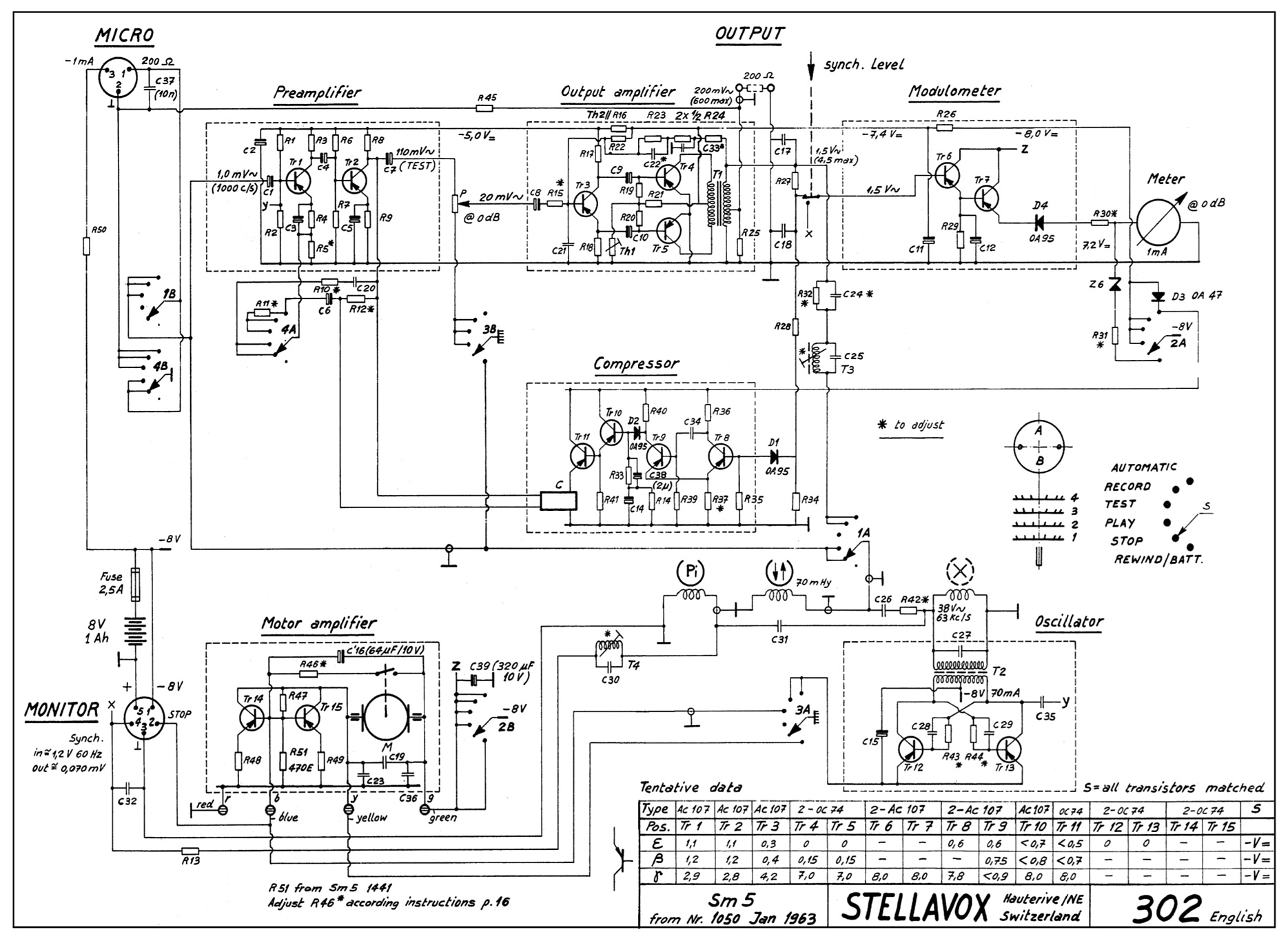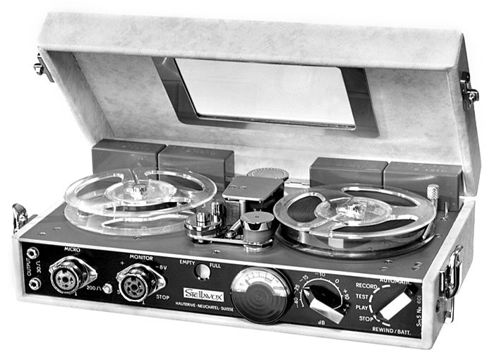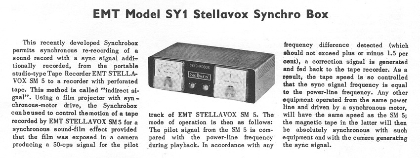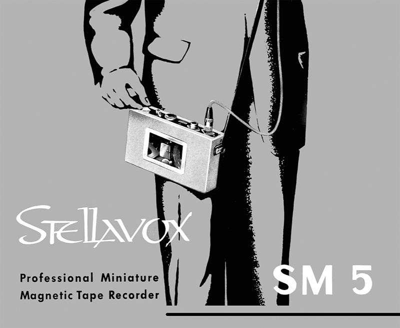 juni 1961: The New Stellavox Sm 5 ... is already available! It incorporates a number of remakable improvements, compared with the former type "Sm 4". The most important ones are quick motory reverse-spooling and automatic volume control by means of an installed dynamic compressor. Morover, new DRYFIT-storage-cells are used to optain a longer time of operation. The recorder is supplied with battery charger and a still more appropriate carrying case. EMT-Courier,
