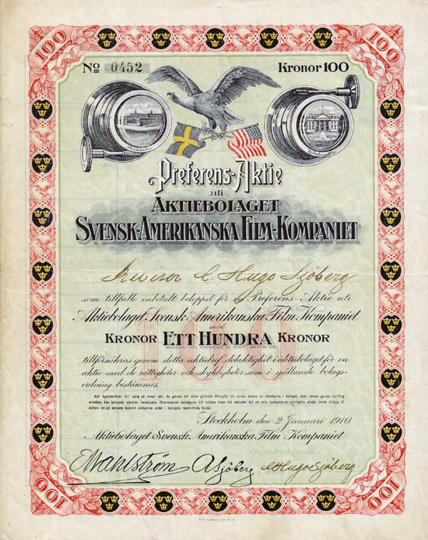 Dagens Nyheter, 9/2 1910 Registrering har beviljats för aktiebolaget Svensk-amerikanska filmkompainet, som har till ändamål att försälja films och kinematografmaskiner, att uthyra films, att under varumärket Globe Film tillverka films samt att driva kinematografrörelse, äfvensom att utöfva förläggarskap af Nordisk Filmtidning. Bolagets styrelse har sitt säte i Stockholm. Aktiekapitalet uppgår till 230.000 kr. och kan utgöra lägst detta belopp, högst 690.000 kr. samt är fördelat i aktier à 100 kr. till viss man. Aktiekapitalet har inbetalts till fullo. Styrelsen utgöres af revisor C. A. E. Sjöberg, direktör C. G. A. Sjöberg och ingenjör E. W. Wahlström, alla i Stockholm. ![]()