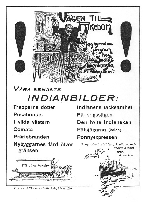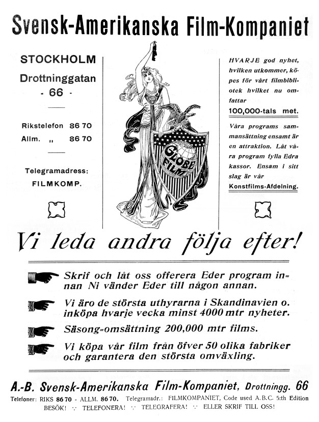Ur Nordisk Filmtidning, januari 1910 Det var en eftermiddag i förra veckan. Jag tog på mig redingoten och ”stormen” samt naturligtvis den nya vinterpaletåen, hvarpå jag ställde min kosa till det stora, för några år sedan uppförda byggnadskomplexet 66 Drottninggatan, som till största delen upptages af det kända och komfortabla Hotell Standard. Jag hade nämligen kommit på den goda idén att hemsöka — i all vänskaplighet förstås — den inom Nordens biografvärld så välkända Svensk-Amerikanska Filmkompaniet. […] —Nå, för att ta’ det från begynnelsen, så när började firman sin verksamhet? —Det var för cirka 1 1/2 år tillbaka. —Och hvad afsåg då firman att handla med? —Då liksom nu var huvudsaken filmuthyrning, men samtidigt föra vi allt utan undantag som hör till våra dagars kinematografi. Vi ha sålunda ständigt på lager projektionsapparater med alla olika tillbehör, vidare filmupprullare, elektriska motstånd, omformare och en mängd andra artiklar, som alla mer eller mindre frågar efter. —Och dessutom kan man ju efter hvad jag i förbigående nu sett, hos firman få sin maskin lagad, om han fått några fel eller lyten? —Ja, det går utmärkt. Våra reparatörer ha särskildt under den här säsongen redan lappat ihop och förbättrat åtskilliga äldre apparater. —Är det månne alltid lika lifligt på kompaniets kontor, som i dag, eller är det en tillfällighet? —Nej, visst inte. man kan hellre säga det vara en tillfällighet, om vi skulle ha en minuts lugn på dagen. Nu under högsäsongen är det alltid som värst naturligtvis, men ännu ha vi aldrig saknat arbete för vår personal, ehuru densamma på dessa 1 1/2 år från 3 nu kommit upp till jämnt 15 personer. —Jo, jag tackar! Det är ju ett lysande resultat. Jag antar, att en af orsakerna till framgången är att det hela tycks vara fotadt på fullt moderna principer. —Jo, det är mer än möjligt, att så är fallet. Men att i allt som rör en affär vara ”up to date” var just en af de många lärdomar, som jag gjorde under min fleråriga praktik i branschen i Förenta Staterna. Hela kontorsmaskineriet arbetar efter modernaste amerikanska mönster. Så t.ex. använder vi för den vidlyftiga registreringen för filmuthyrningen ett särskilt kortsystem. [...] Innan jag gick förskaffade jag mig emellertid visshet om en nyhet, jag hört, nämligen att firman nyligen ombildats till aktiebolag. Det bildades den 1 Jan. d. å. med ett inbetaldt kapital af 230.000:- kr. Dess hufvudsäte blir Stockholm och styrelsens ordförande och kassadirektör är revisor C. Hugo Sjöberg, under det att direktörssysslorna delas mellan hrr A. Sjöberg och E Wahlström. Bolaget kommer att fortsätta och utveckla ”kompaniets” rörelse och därvid särskildt mer än hittills tillverka svenska filmer. ![]() Stort