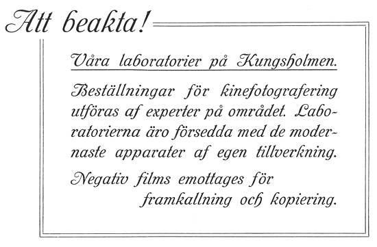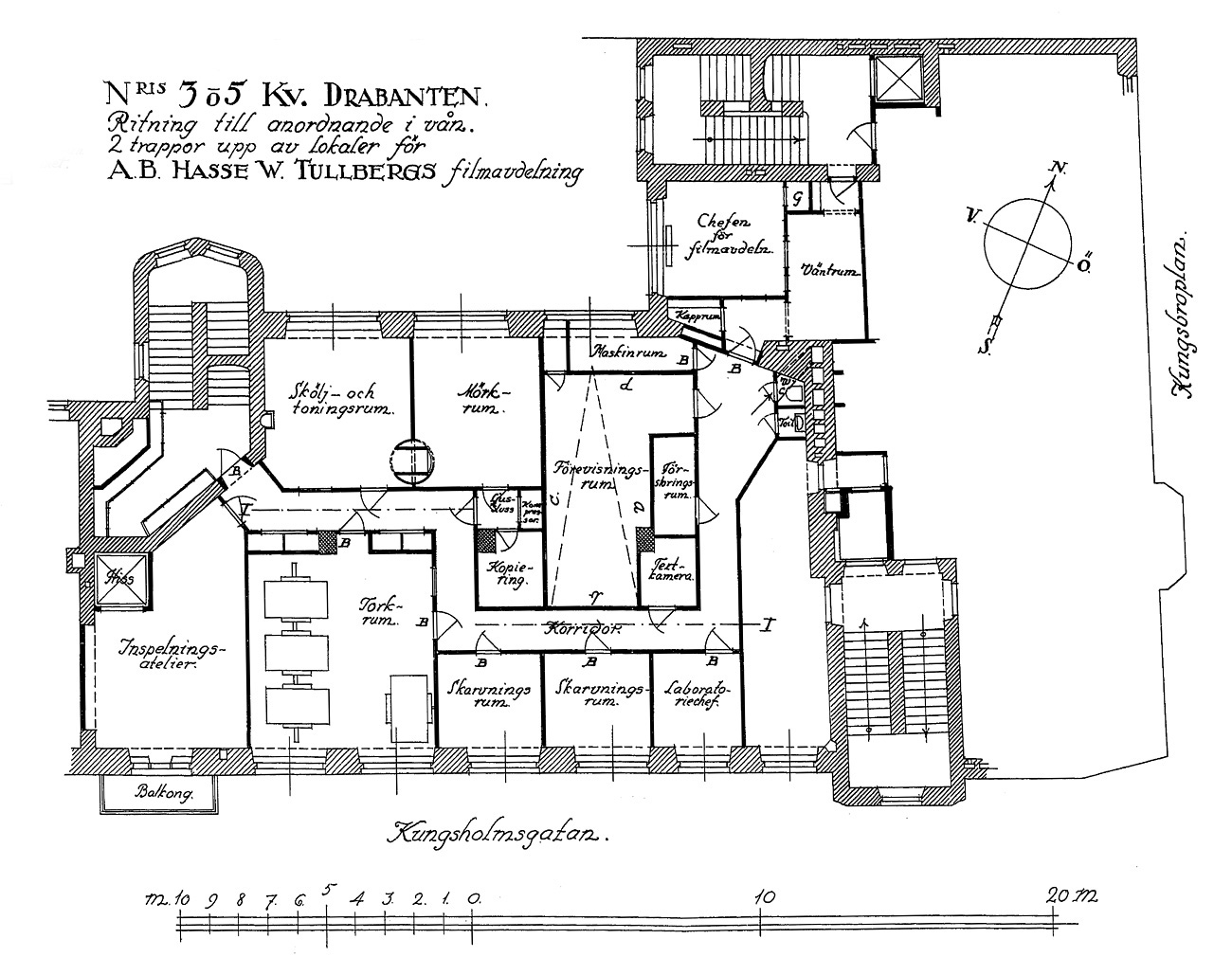 ![]() Kungsbroplan 3 i Stockholm. Huset byggdes 1907-09. Byggherre och ägare var Hasse W. Tullberg. Boktryckeri, bokbinderi och blankettförlaget AB Hasse W. Tullberg, med adress Kungsbroplan 3 i Stockholm, ingick från 1918 i Holdingbolaget AB Sveriges Litografiska Tryckerier (SLT). Under flera år fram till 1919 fanns även ett filmlaboratorium i huset på Kungsbroplan. Det var Pathé Frères svenska filial och senare Filmindustri AB Skandia som hade hyrt in sig hos Tullbergs. (Svenska Pathé blev en del av Skandia, när det bolaget bildades 1918.) ![]() Ur Pathés svenska katalog, 1911. Skandia hade dessutom ett labb i sin nybyggda ateljé i Långängen, som togs i bruk sommaren 1919. I slutet av 1919, när Skandia gick ihop med Svenska Bio och blev Svensk Filmindustri, upphörde Skandias verksamhet och labben stängdes. Tullbergs startade en egen filmavdelning i sitt hus på Kungsbroplan år 1920, med kapten Ragnar Ring som chef, manusförfattare och regissör. De närmaste åren ägnade sig filmavdelningen huvudsakligen åt industri- och reklamfilmsproduktion under namnet AB Hasse W. Tullbergs Filmindustri. Kanske som en liten blinkning till AB Svensk Filmindustri. Filmavdelningen ansökte genom AB Hasse W. Tullberg på hösten 1922 om tillstånd hos stadens byggnadsnämnd om att få inreda lager för max 1500 kilo film på vinden i huset på Kungsbroplan. Bygget besiktigat och godkänt i januari 1923. I september 1923 ansökte Tullbergs om tillstånd att få anordna nya lokaler för en filmavdelning två trappor upp i sitt tryckerihus. Bygglov beviljades i oktober 1923. Besiktigat och godkänt i början av 1924. År 1924 gjorde filmavdelningen två långfilmer, Björn Mörk och När millionerna rulla, med manus och regi av Lasse Ring (pseudonym för Ragnar Ring). Framgångarna uteblev dock. AB Tullbergs Film bildades 1925. I den vevan tog man över bokförläggare Birger Wahlströms ateljé i Centralsaluhallen vid Kungsbron i Stockholm. Wahlström hade bildat BeWefilm 1922 och affärerna hade till att börja med gått alldeles förträffligt. Men fortsättningen blev inte lika lyckosam. BeWefilm gjorde sin sista film 1925. AB Tullbergs Film avvecklade sin verksamhet 1934. Bolaget köptes av Einar Förberg och blev Förberg Film AB. Laboratorieutrustningen tog Albert Wickman hand om till sitt nybildade AB Film-Labor. ![]() ![]() Augusti 2015 |
