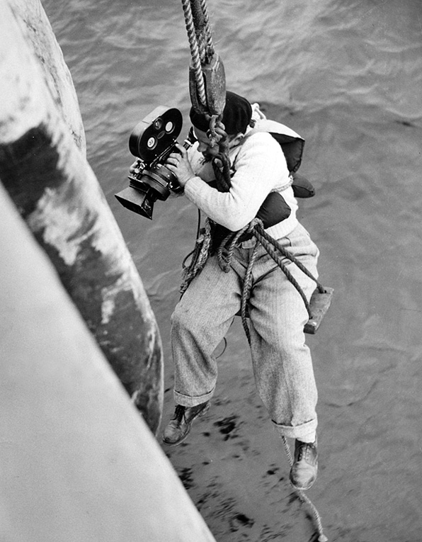Så här dramatiskt kunde filmfotografens arbete vara.Bilden visar dokumenteringen av utläggning av Gotlandskabeln 1953, en beställningsfilmer för Kungliga Vattenfallsstyrelsen. Till startsidan
