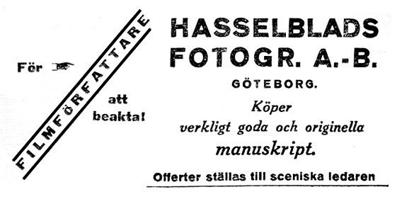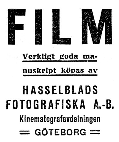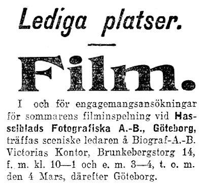 månader. År 1915 hade bolaget förlagt sina inspelningar till bakgården till biografen Victoria på Kungsgatan 46 i Göteborg. Löjtnant Georg af Klercker, 193 centimeter i strumplästen, arbetade åren 1915-18 som ensam regissör, konstnärlig ledare, och produktionschef för Hasselblads Fotografiska AB i Göteborg, och gjorde under den perioden sammanlagt omkring 30 spelfilmer. Fotografer var Carl Gustaf Florin, Gustav A. Gustafson, Gösta Stäring och Sven Pettersson. Inspelningarna gjordes alltid sommartid när ljuset gav tillräcklig exponering och skådespelarna var teaterlediga. Filmernas speltid varierade mellan 9 och 76 minuter. Närmare bestämt 41, 27, 37, 9, 18, 32, 59, 51, 62, 41, 16, 61, 17, 9, 47, 26, 57, 73, 35, 46, 38, 40, 66, 35, 76, 68, 60, 61 och 67 minuter. Under 1916 regisserade Georg af Klercker hela 15 filmer som i genomsnitt blev 36 minuter långa. Men det höga arbetstempot tärde på honom, och när årets inspelningsperiod var över tvingades han kurera sig på Tyringe sanatorium. ![]() Annons i Aftonbladet, 1 mars 1916. ![]() Annons i Aftonbladet, 1 mars 1916. ![]() Annons i Dagens Nyheter, 17 mars 1916. Tidskriften Filmbladet, den 1 maj 1917: ”Hasselblads nya inspelningar ha redan den 25 april tagit sin början vid inspelningsateljén i Göteborg. En del ändringsarbeten ha dessförinnan vidtagits i ateljén, i det att synnerligen rymliga klädloger i dubbla rader inrättats, damernas en trappa upp och herrarnes i bottenvåningen.” När Filmindustri AB Skandia bildades 1918, genom en sammanslagning av kinematografavdelningen på Hasselblad Fotografiska AB, Victorias Filmbyrå, Biograf AB Victoria, Svea films, Biograf AB Sverige och Pathé Frères svenska filial, beslutade bankmän och filmdirektörer att det nya bolagets verksamhet skulle förläggas till Stockholm. Strax börjar man bygga en ateljé vid Långängen i Stocksund. Under 1919 gjorde Filmindustri AB Skandia några sista filmer i ateljén på Otterhällan, sen stängdes den för gott. (En del menar att det bildades ett aktiebolag med namnet Hasselbladfilm inför inspelningarna i Göteborg. Så skedde aldrig. Namnet finns helt enkelt inget i Bolagsverkets arkiv, utan användes förmodligen bara som ett varumärke.) Klicka här om du vill läsa mer om Hasselblads. |