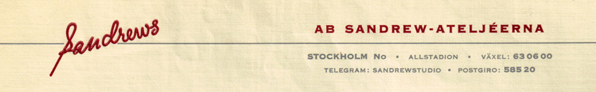 | A: | Inspelningsateljéer, A- & B-hallen. Byggnaden var delad i nord-sydlig riktning. A-hallen åt väster och B-hallen åt öster. A-hallen var något större. Sandrews fotografer de här åren var Hilding Bladh, Rune Ericson, Sven Nykvist, Bertil Wiktorsson, Arne Brandhild och jag, Hans Svanberg. (HS) |