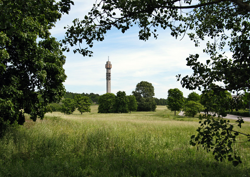 pekar mot öster. Mellan förgrundens grönska och Kaknästornet ser du