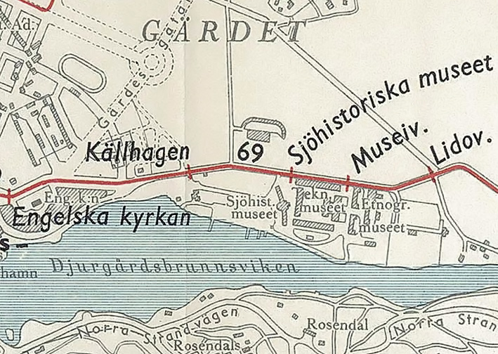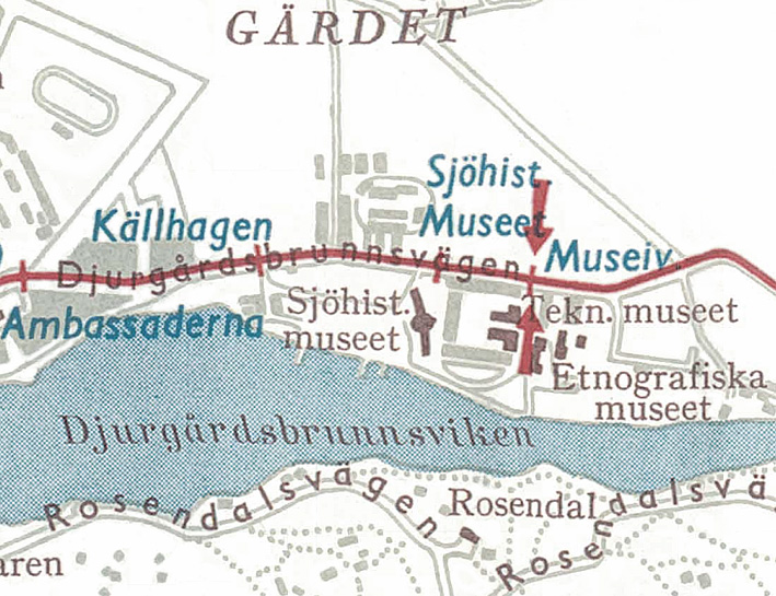 (1948). I bildens högerkant sträcker sig Djurgårdsbrunnsvägen. |