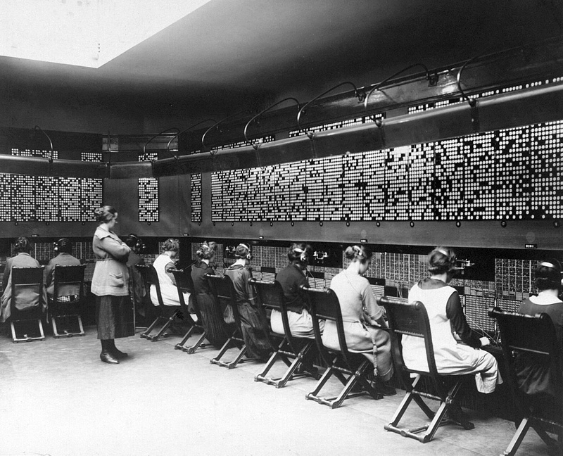 Bilden är tagen 1933-34. Fotograf okänd. Aktiebolaget Stockholmstelefon bildades 1908 och hade sin telefonstation för Östermalm i huset Sibyllegatan 24, vars gård byggdes över för verksamheten 1910. Telefonstationen monterades ned 1933. Efter några år togs lokalerna över av en pantbank. Samtidigt byttes gårdsöverbyggnadens tunna glastak mot ett välvt i glasbetong. Roy Andersson flyttade in i huset år 1981 och gjorde den överbyggda gården till en filmateljé på omkring 200 kvm. |