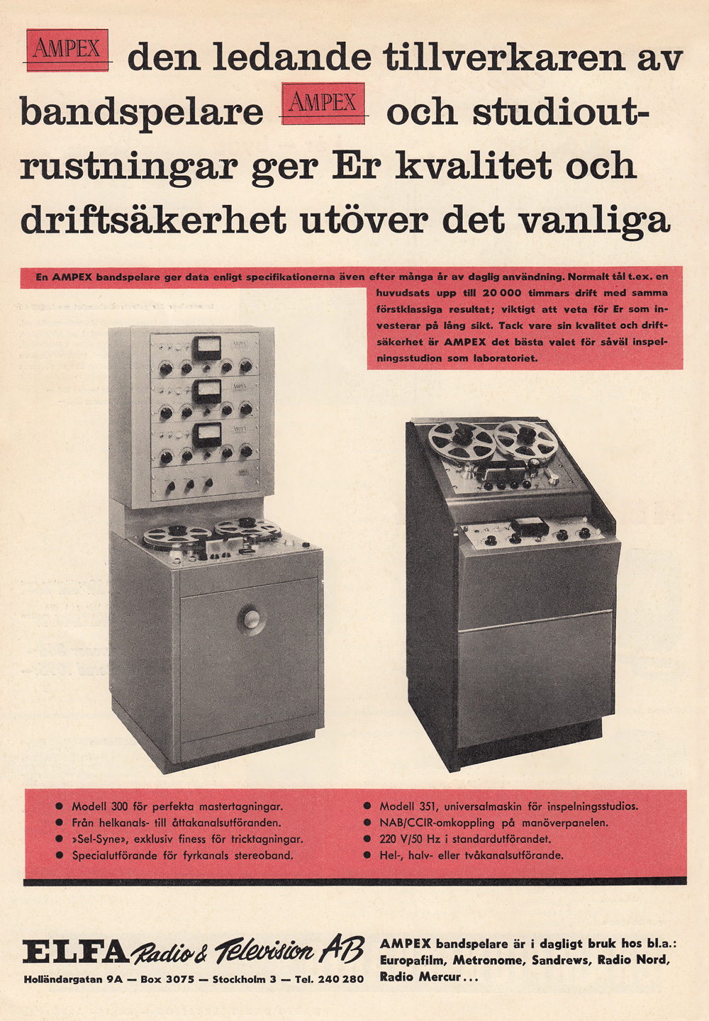 hitlåt ”Spel-Olles gånglåt”. Mannen bredvid mig var den mycket produktive producenten Sture Wahlberg, som då jobbade för bolaget Polydor och som tidigare varit verksam för Decca. Han startade senare bolaget SweDisc tillsammans med en annan topproducent, Roland Ferneborg från bolaget Karusell. När svensktoppsvågen slog in öven folkhemmet under 60-talet kom jag även att spela in Owe Thörnquist, Anita Lindblom, Lill Babs, Monica Zetterlund, Sven Ingvars, Cool Candys, Gunnar Wiklund och Owe Thörnquist. Och så småningom även Harry Belafonte, Bill Haley, Oscar Brown Jr, Eartha Kitt och Erroll Garner. Högtalaren på väggen bakom vill jag minnas var till för kommunikation med bandkontrollen, en enkel Sinus-högtalare från Svenska Högtalarfabriken AB. |