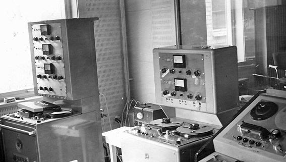 | Bandkontrollen till Stora musikstudion i början av 60-talet. Alla bandspelare kom från Ampex. Över fönstret satt tre kontrollhögtalare tillverkade av Tandberg, en för varje kanal. Vid den här tiden hade nämligen en bandspelare i musikstudion max tre kanaler som i stort sett alltid mixades ner till mono. |