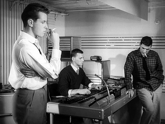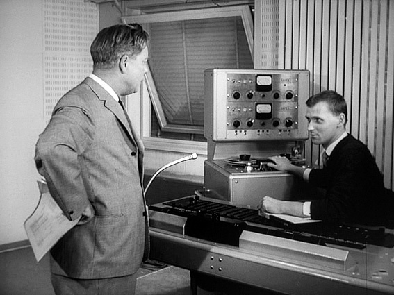 | Kontrollrummet var ännu inte färdiginstallerat när filmen spelades in, vilket syns om man tittar noga. Jag tror vi dolde det på olika sätt och rullade in en Ampex 2-kanalare som såg lite proffsig ut i sammanhanget. |