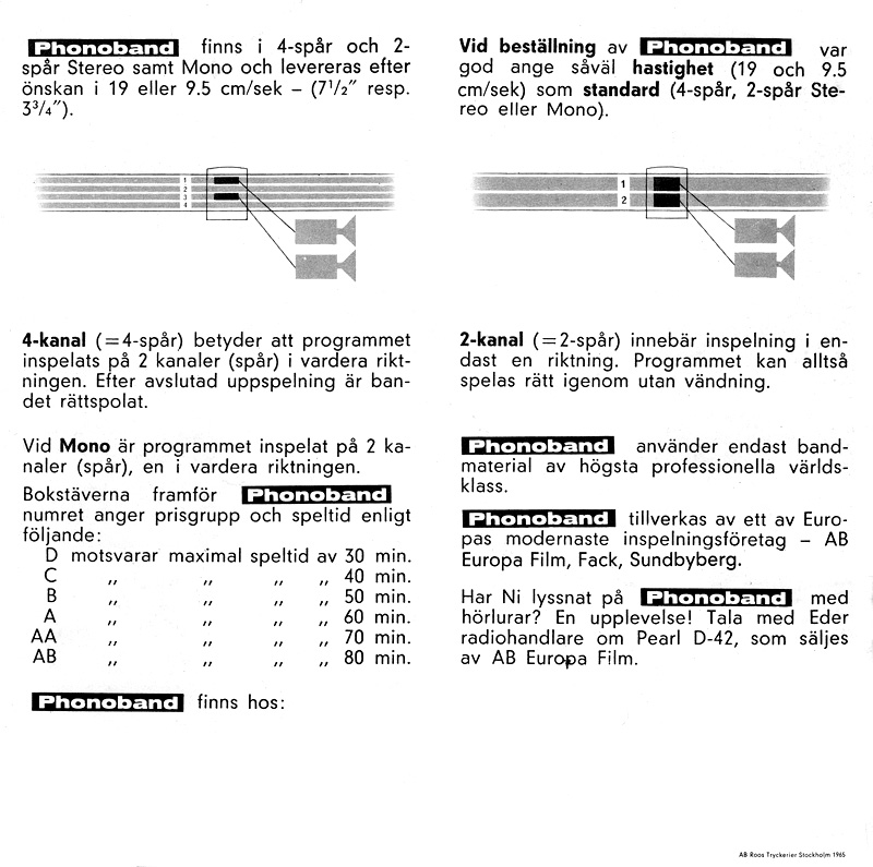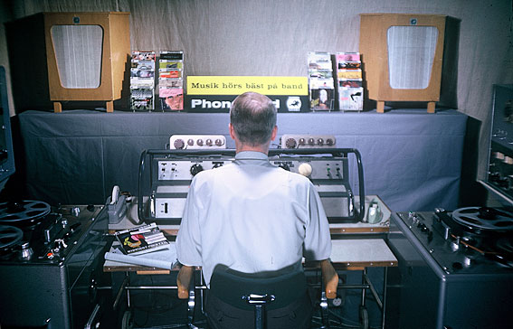 i Expressen den 1 november 1958: ”—Vi [AB Maskin & Elektro i Örebro] började planera vår PHONOBAND-tillverkning för två år sedan, säger hr [Rolf] Zetterlund. Vi byggde en inspelningsstudio och inköpte en kopieringsmaskin av märket Ampex. Jag var beredd att det kunde komma att ta sin tid att arbeta in nyheten, ty svensken är ju inte lika nyhetsminded som amerikanaren. Samtidigt hoppades jag dock, att den höga ljudkvalitet som vi kunde hålla tack vare vår högklassiga inspelningsapparatur, skulle hjälpa till att övertyga folk om de färdiginspelade bandens fördelar.” (…) ”Anläggningen i Örebro består av en mastermaskin och tre s.k. slavar. (…) Banden drivs med en hastighet av 60” per sek. och genom speciella förstärkare som arbetar med frekvenser upp till 120.000 p/s, matas inspelningen över från masterbandet till de tomma banden. Ett normalt band på 1.200 fot kopieras på 4 minuter.” ![]() AB Maskin & Elektro i Örebro var även svensk representant för bandspelare tillverkade av Tandberg och Ampex. Men luften började gå ur örebroföretaget när Tandbergs Radiofabrikk A/S i Norge bildade sitt dotterbolag Tandberg Radio AB, med adress Erik Dalbergsgatan 50 i Stockholm, för att från 1 april 1960 ta över försäljningen i Sverige av bolagets alla produkter. I början av 60-talet släppte AB Maskin & Elektro i Örebro sin Ampex-agentur till ELFA Radio & Television AB på Holländargatan 9A i Stockholm, och 1962 tog Europa Film i Mariehäll över bandkopieringen. |