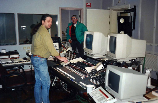 från Tomas Krantz: Bild från dubbstudion 1995. Bengt Johansson (vaktmästare) i bakgrunden. Bakom glasrutorna till vänster fanns ett maskinrum för dator, hårddiskar, interface och en 24-kanalare. Q-Lock till höger i bildens förgrund. Den användes bland annat för att koppla ihop en 24-kanalare med en U-Matic när vi gjorde ljudefterarbetet till TV4:s första dramaserie ”Destination Nordsjön”, som sändes 1990. Förmodligen det första jobb jag gjorde i den nya dubbstudion. ![]() Kommentar från Lasse Lundberg: På Filmmixarna hade vi U-Matic och 24 kanalare i brytningstiden mellan analogt och digitalt, när Dyaxis hade kommit. Vi ljudlade i Dyaxis och förde sedan över ett spår i taget till 24-kanalaren, sen mixade vi från den. Ibland hade en del blivit ljudlagt på perfo i klippbord. Men eftersom allt kunde synkas till U-Matic, även perfo, var det bara att förda över 17,5 mm-rullarna till 24-kanalaren inför mixningen. Synksystemet var Editron. Skulle vi flytta ett ljud ett par rutor blev det besvärligt. Då fick vi göra det utanför 24-kanalaren, alltså i klippbordet eller i Dyaxisen och sen för över det till 2"-bandet igen. Slutmixen hamnade under en tid på 1/4", som sen fick föras över till perfo så att vi kunde göra optiskt ton. Det var någon gång under den där tiden som mitt hår blev helt grått. ![]() I slutet av juni 1998 gick Europa Studios i konkurs. Bolaget omorganiserades och filmljudavdelningen köptes upp av Gábor Pasztor, Christer Abrahamsen (Cinema Art) och Bosse Jonsson (Viking Film), som tillsammans bildade Europa Post Production AB. Musikstudion såldes till Nordstudios och videoavdelningen gick till Motion Media. Bosse Jonsson och Christer Abrahamsen tog över Fastighetsbolaget Berglinan AB, som ägde studiolokalerna. Runt 2004 bytte Europa Post Production AB namn till Europa Sound Production AB. År 2007 flyttade Europa Sound Production AB till Filmhuset vid Gärdet i Stockholm. Studiolokalerna i Mariehäll började rivas 2008. |