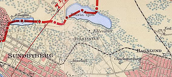 Nya Spårvägs AB (SNS) år 1907 köpt lantegendomarna Ellenhill och