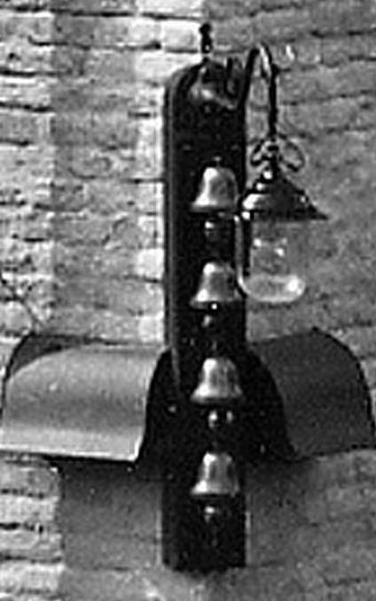 | Fyra mässingsklockor till skydd för lika många glödlampor, så förmodligen en tystnadssignal, en uppmaning till lugn och ro. Ringklockor, som gjorde folk på gårdsplanen uppmärksamma på att en inspelning skulle starta, fanns troligen under de båda kåporna som flankerar brädan med lampor. |