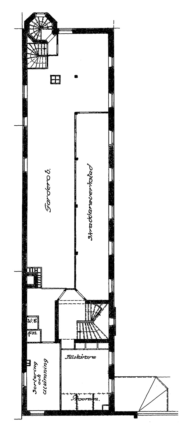 våningen äro skrädderiverkstaden och garderoben inrymda. Till källaren