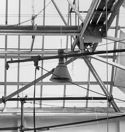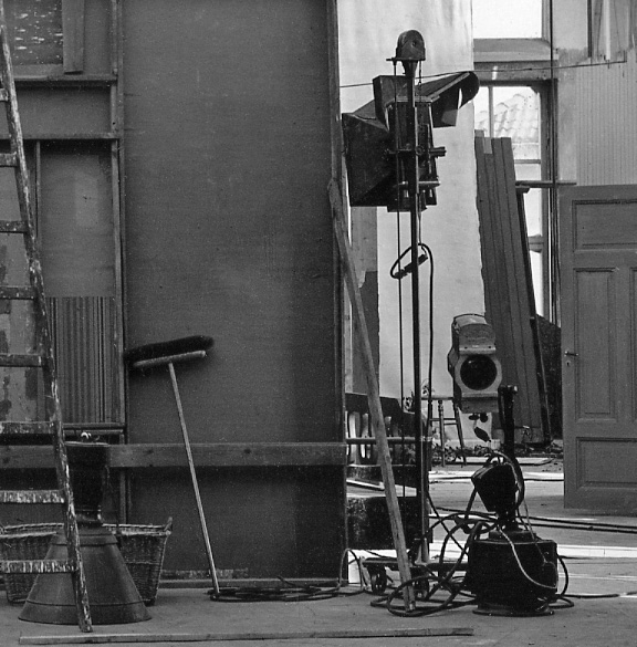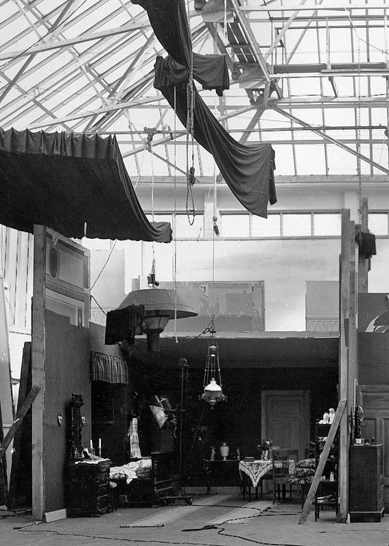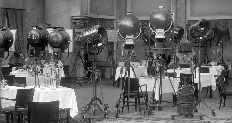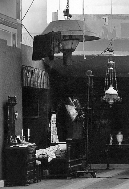 sådan, avsedd att slå ljus i taket i en fabrikslokal. Men eftersom filmateljéer vid den här tiden hade högt belägna glastak, byggde filmfolk ett litet tak i form av en reflektor kring lampan. Fabrikslampan på bilden till vänster är tillverkad av Körting & Mathiesen A.G. i Leipzig, ett företag som började bygga båglampor 1889 och från 1914 sålde sina lampor under varumärket Kandem. De hade återförsäljare i både London och New York och tillverkade även lampor speciellt avsedda för filmbranschens behov. |
