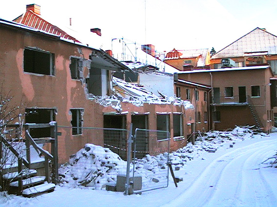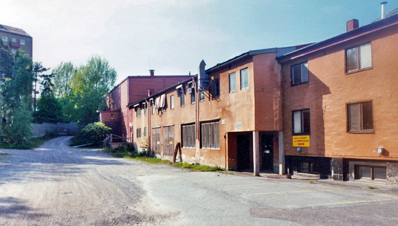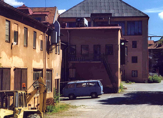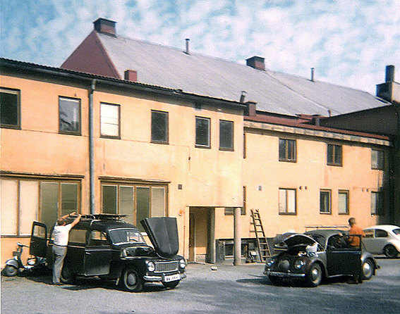 | Den här bilden är tagen 1968, det år då Svensk Filmindustri definitivt lämnade Filmstaden. Fönstren bakom Volvo Duetten hörde till den finmekaniska verkstaden. I våningen ovanför fanns text- och trickavdelningen. Till höger om pelaren, bakom den grafitgrå folkan, hade ljudavdelningen en del av sina lokaler. Det branta taket i bakgrunden hörde till stora ateljén. Just till höger om den vita folkan fanns den entrén till ljudavdelningen som du kan se på det svartvita fotografiet ovan. |