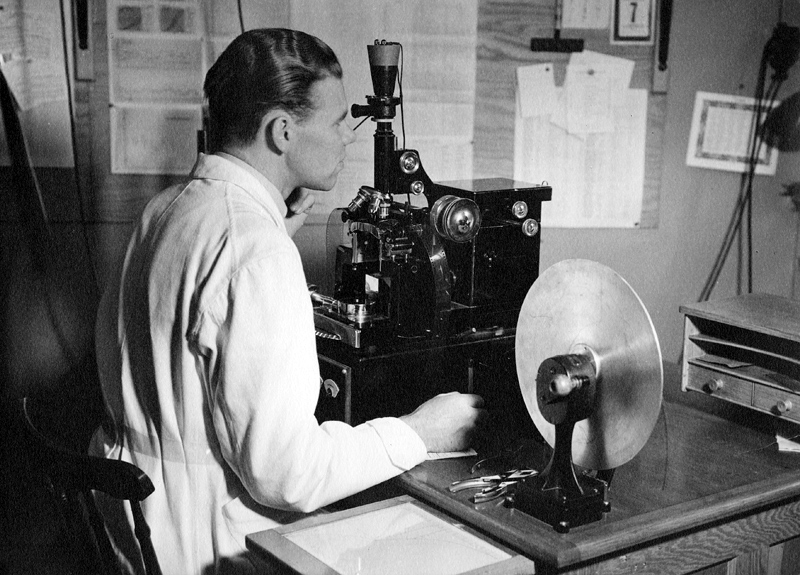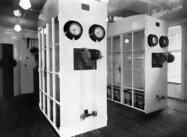 Framkallningsmaskin tillverkad av Debrie och inköpt 1931. Mörkrumssidan.