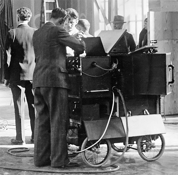 dagen, vilket motsvarar 56.940:- år 2016. Utrustningen hade beteckningen SA (Synchron-Apparatur) och var konstruerad för Tobis av Joseph Massolle. Ljudvagnen innehöll batterier, elektronik och en ombyggd Eclairkamera (Caméréclair) för 120 meterskassetter. I Tyskland kallades den för ”tevagnen”, och ibland också ”barnvagnen”. I Sverige fick den ofta heta ”korvståndet”. Bildkameran, som ingick i inspelningsutrustningen, var en Debrie Parvo som Tobis hade byggt in i en ljudisolerande låda, en så kallad blimp. Både ljud- och bildkameran drevs av batterier. Synkronitet mellan bild och ljud fick man med en teknik som brukar kallas interlock, eller selsyn (från self och synchronizing), och som bestod av en sändare/drivare/generator och en mottagare/slav/motor som var elektriskt anslutna till varandra på så sätt att drivarens läge alltid överensstämde med slavens. I det här fallet satt drivaren monterad i ljudkameran och slaven (motorn) i bildkameran. När ljudkameran startade rullade också bildkameran och de båda enheterna gick alltid synkront. Joseph Massolle installerade först en sorts glimlampa som oscillograf i sina tonkameror, en ”Ultra-Frequenzlampe” konstruerad av Tri-Ergon. Senare förekom Kerrceller. Ljudspåret från Tobis tonkamera är av intensitetstyp (variable density, varierande täthet). |