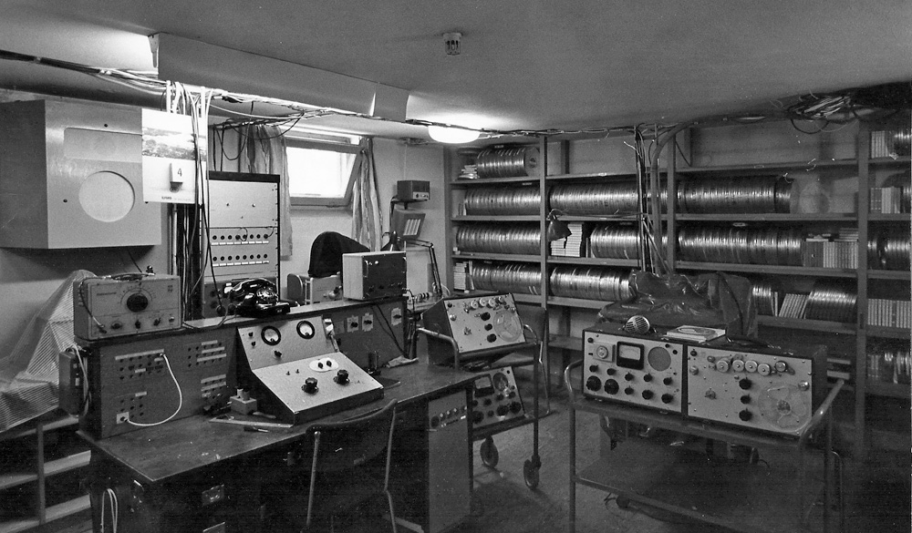 är bilden är från början av 1960-talet. Till vänster på väggen hänger en Isophon-högtalare modell G3037. Till vänster på kontrollbordets pult står en vanlig tongenerator, tillverkad av Philips, och till höger på pulten en dubbeltongenerator som användes vid inspelning till optiskt ljud. De båda bandspelarna är Lyrecs TR2/AR2. På bänken under högtalaren och det öppna fönstret skymtar två optiska tonkameror. I hyllan till höger står plåtburkar med magnetfilm, original från pågående inspelningsverksamhet och inspelade med AGA:s mobila perfomaskin. I hyllan skymtar också några 1/4"-band, men ännu så länge ganska få. Om något år kommer 1/4"-banden att vara i majoritet. Ganska snart byggdes rummet om för att bli en ren magnetövespelning, och en vägg med glasruta kom på plats så att inte perfomaskinerna skulle störa. Lyrec-bandspelarna byttes ut mot två Telefunken M5 och de båda tonkamerorna flyttades till ett angränsande rum som blev en optisk överspelning. ![]() Kommentarer från Ulf Park: Dubbeltongeneratorn tillverkades av SELA och var standard i Sverige och flera andra länder. Den vanligaste effekten av distorsionen var extremt vassa s-ljud. Under den sista tiden med optiskt ljud, innan magnetfilmens införande, förekom det att dubbelton spelades in även vid filminspelning på fältet, inte bara vid mix- och överspelningsarbete. Kuriosa: När magnetljudet var en nymodighet, och man skulle spela in musik till en film, då litade man inte riktigt på magnetfilmen utan valde istället att spela in optiskt. ![]() Kommentar från Hans Eric Ahrn: En dubbeltongenerator användes för att optimera den fotografiska processen vid framställning av optiskt ljud. Den levererade, som namnet antyder, två toner samtidigt med 400 Hz skillnad. Till 35 mm kunde det röra sig om 6600 och 7000 Hz upp till 8600 och 9000 Hz. En sådan dubbelton spelades alltid in efter programmet, i slutet av varje filmrulle, vid överspelning till optiskt ljud med amplitudmetoden. Den användes sedan för att minimera en distorsion som uppstår på grund av överstrålning i emulsionen, och som vid kopiering kunde kompenseras med rätt svärta på ljudspåren. Dubbeltonen kontrollerades i ett oscilloskop, eller i ett för ändamålet speciellt framtaget mätinstrument. Skillnadsfrekvensen mellan de två inspelade tonerna, 400 Hz, är ingen tillförd ton utan den uppstår när symmetrin i ljudspåret blir förskjuten. Fenomenet är en intermodulationsdistorsion och brukade kallas likriktningseffekt. Den kunde höras på s-ljud i tal, som blev onaturligt tjocka och fräsande redan vid små förskjutningar av symmetrin. På andra ljud kunde den låta som ett bakgrundsbuller (donnereffekt). |